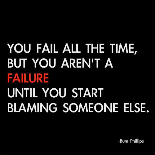 Now, think that through for a moment: you are not a failure…until you start blaming others for your mistakes.  What does that really mean?  Now, I’m not trying to talk down to anyone, because I didn’t fully understand this myself until just this week.  Here’s what I discovered when I really dug into the meaning in these simple words.