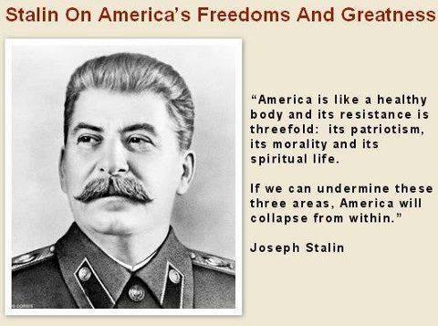 Let me see if I can make my case with you.  Just for the sake of argument, assume I am correct and the Progressive Left in this country has been working by incremental steps to create a situation  in this country — a crisis, if you will — that will provide them with the excuse they need to complete their destruction of the Constitution.  Also assume that these people accepted Stalin’s advice and have decided that this requires them to weaken the body of America by destroying patriotism, morality and spirituality in our society.  Allow yourself to think in these terms, then ask yourself the following questions:
